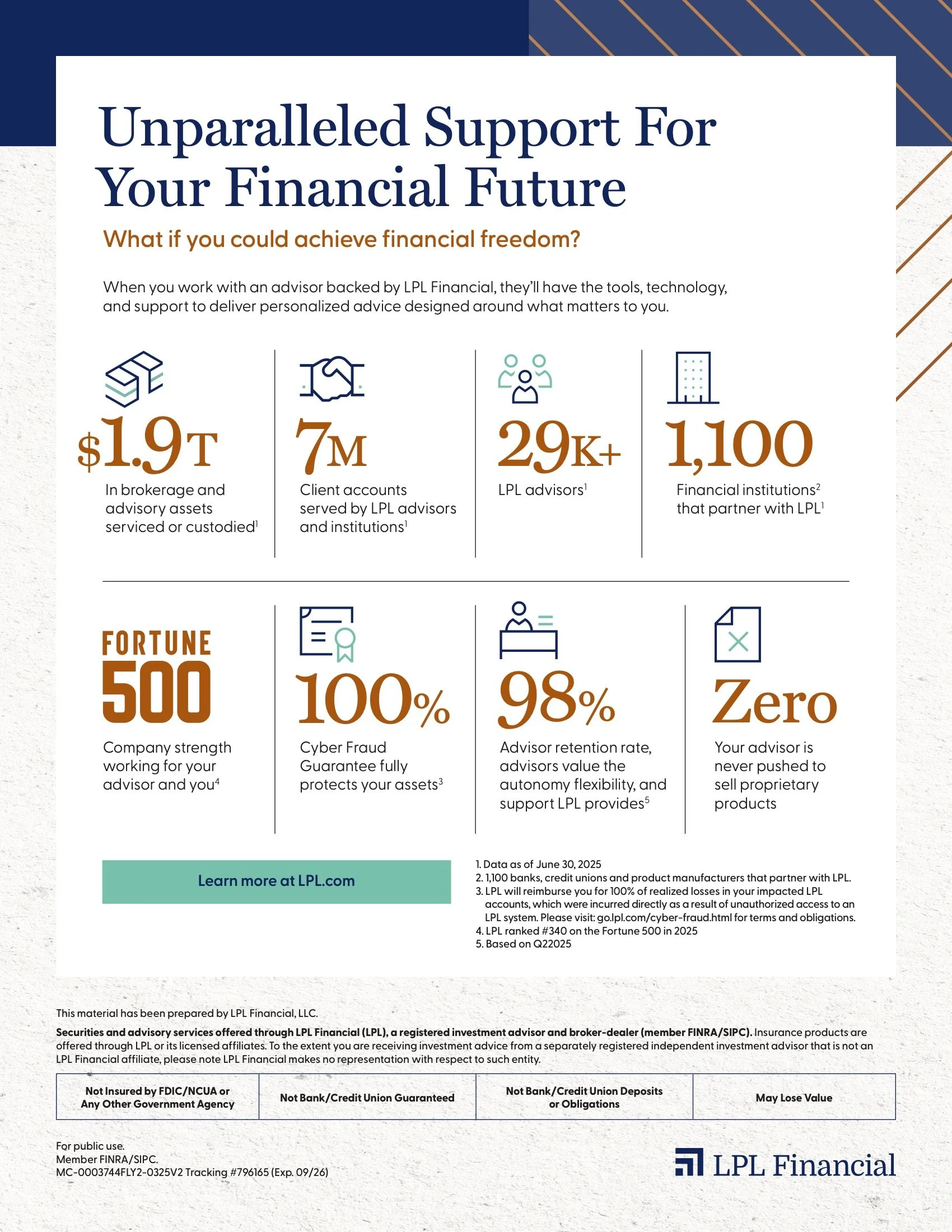 LPL is one of the nation’s largest independent broker-dealers, with over $1.9 trillion in brokerage and advisory assets*, serving 7 million client accounts* through more than 29,000 financial professionals and 1,100 financial institutions. This relationship allows me to provide you with the personalized advice of an independent advisor, backed by the scale, security, and resources of a Fortune 500 firm. *as of June 30, 2025